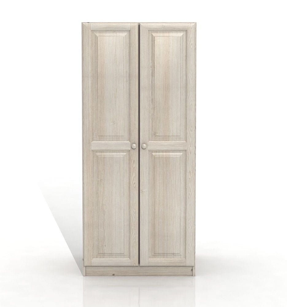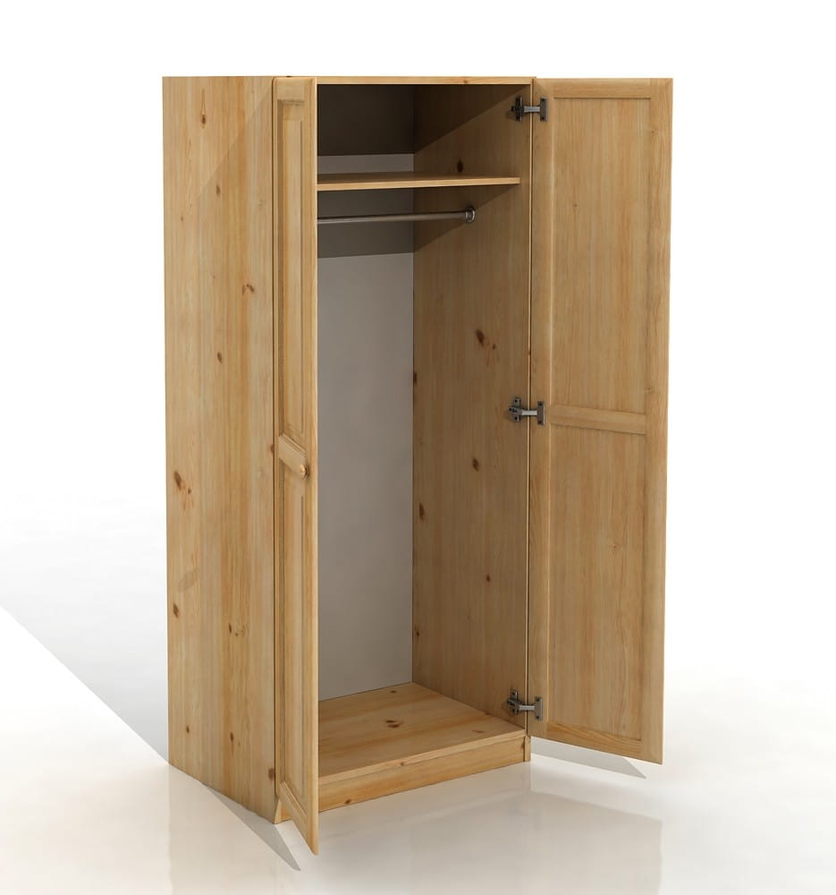 Standardowa, dwudrzwiowa szafa drewniana. Wewnątrz półka oraz drążek na ubrania. To wszystko co niezbędne. W ofercie również inne modele, mniejsze oraz większe szafy. Istnieje możliwość zamówienia drzwi z lustrem.
